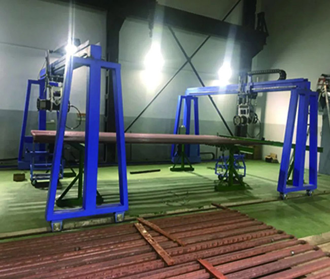 4). 不同位置的焊縫,均可通過龍門架與平板小車的運(yùn)動,到達(dá)檢測位置,全部焊縫檢測完畢后,移開龍門架,用行車將管排移動至運(yùn)管小車上。