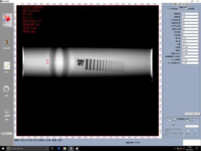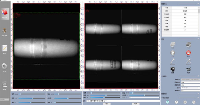 2). 焊縫運(yùn)行至檢測位,光閘開啟,X射線開始透照,可手動旋轉(zhuǎn)焊縫或通過預(yù)先設(shè)定的程序自動采集3-5幅不同角度的焊縫影像。